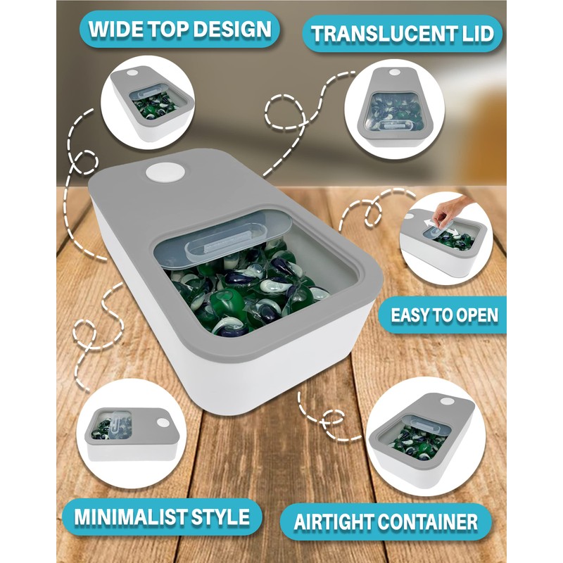 - [LAUNDRY PODS CONTAINER WITH SLIDE LID] - Our Laundry Pods Holder Storage Container with Slide Lid has an elegant design that makes it easy for you to open and fill it in. This laundry pod storage container has a transparent cover lid where you can effortlessly check what’s inside and keep your laundry soap pods fresh and tidy. This laundry detergent holder will also help prevent your laundry pods from drying out too quickly
