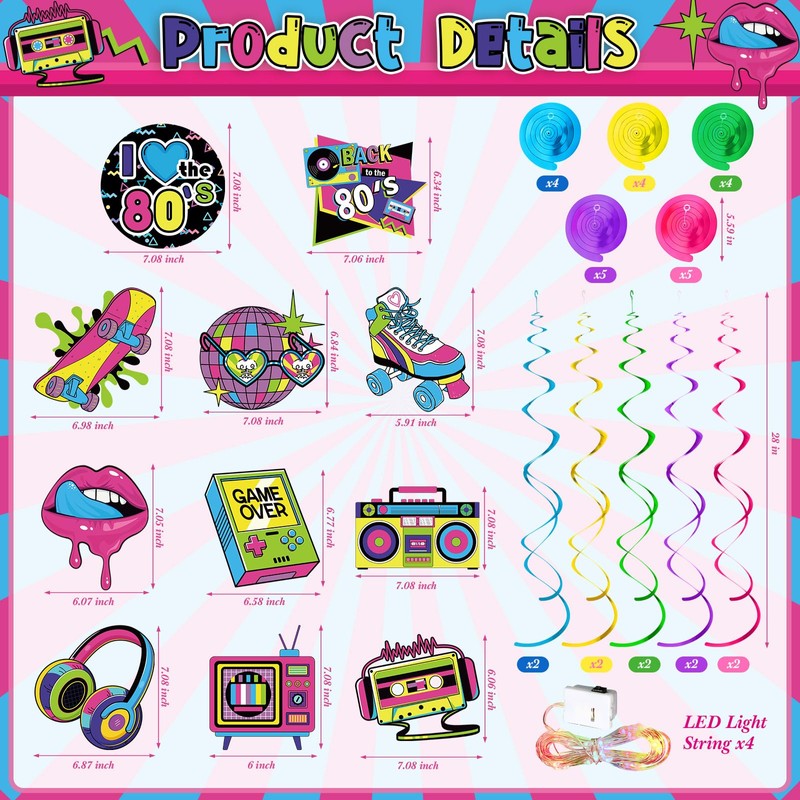 - Material and Size: these 80s party decorations are made of quality foil and double-sided cardboard, not easy to fade or break, vivid and bright in color; 80s hanging cutouts come between 4.7 -7.1 inch in diameter and each swirl can extend to approx. 30–38 inches in length; Each string light is 3.28ft, pretty and eye-catching