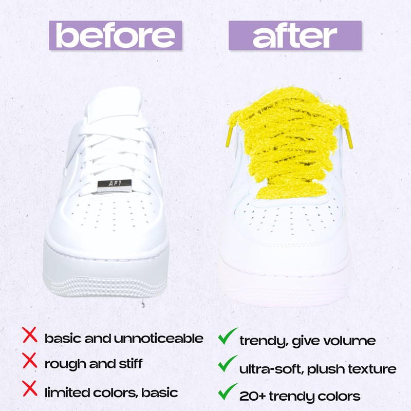 - The purple will delight you: plush laces with 15 mm diameter, specially designed for fashionable sneakers. Simple but colorful, this purple plush shoelace adds original style to your sneaker