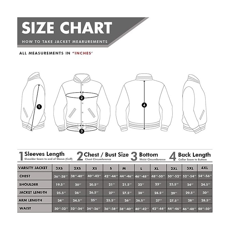 - [SIZING]: Unisex sizing fits men and women from sizes XS to 3XL in 5 colors. All our new style letterman jackets are updated to the standard US size. So better consult the size chart before ordering our authentic American styled Varsity Jacket for individuals, teams, clubs and groups.