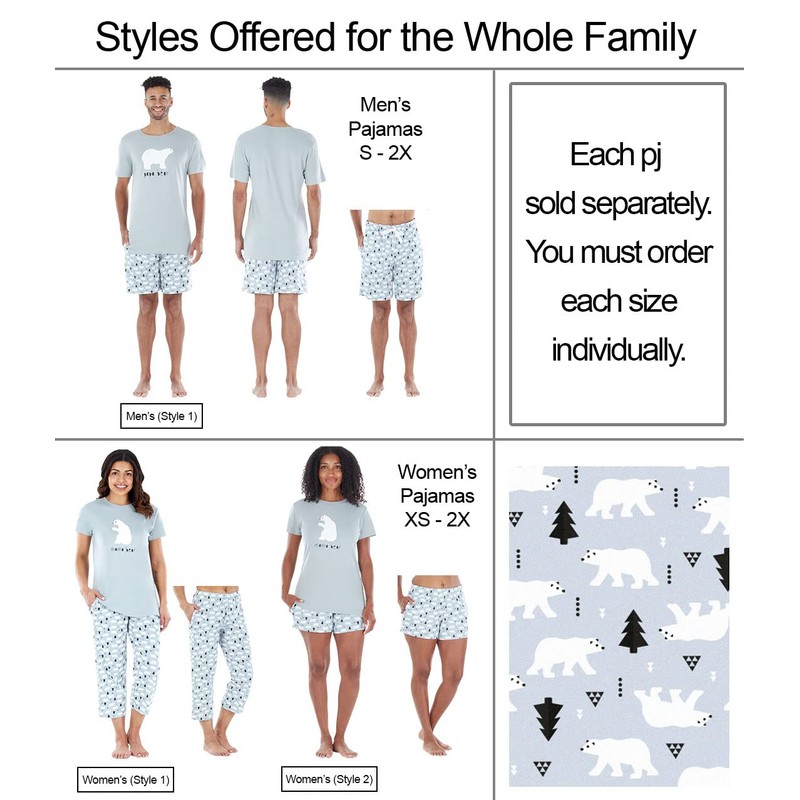 - Get your whole family holiday card ready with these festive pajamas that feature several different patterns including light grey polar bear, dark grey bear paw, and blue winter animals. Each pajama has coordinating allover print pants