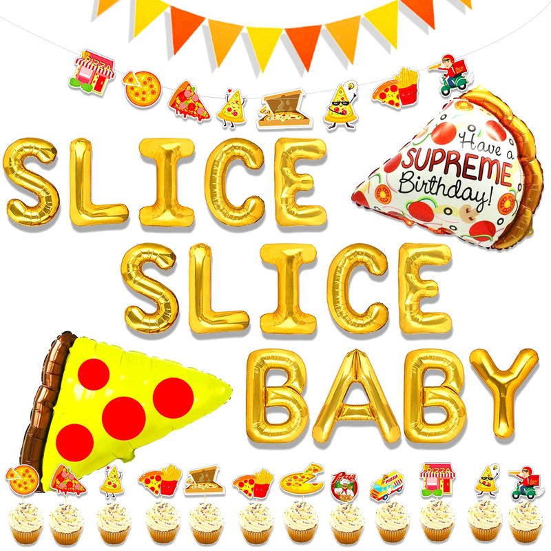 - You will get: 1 X "Slice Slice Baby " Balloons ,1 X Banner, 2 X Pizza Balloons ,12 X Pizza cupcake toppers