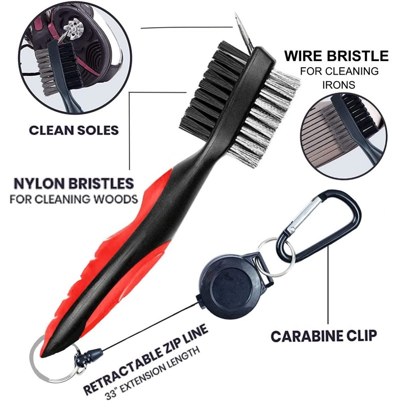 - cepillo para polvo de limpieza de golf: cepillo para polvo limpiador de palos de golf duradero de doble cara con alambre de acero de un lado y nailon de otro lado. La aguja afilada puede limpiar toda la suciedad de la parte inferior del zapato y de la ranura. El limpiador de ranuras para cepillo para polvo de palo de golf tiene mosquetón retráctil de aluminio con cierre de 2 pies que se puede fijar fácilmente con una bolsa de golf. Nuestro cepillo para polvo limpiador de palos de golf tiene una cubierta protectora y el cepillo para polvo de golf tiene un agarre de plástico extremadamente resistente.