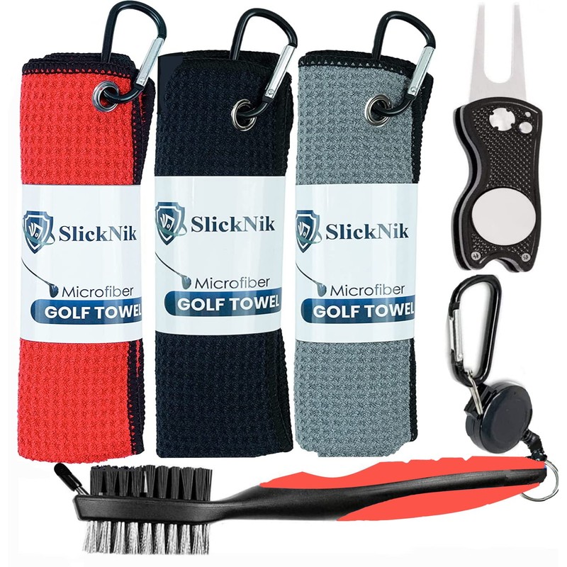 SlickNik - Paquete de toallas de golf - 3 toallas de golf de microfibra con patrón de gofre, incluyendo cepillo para polvo de palo de golf y herramienta de reparación de divot limpiador de ranuras