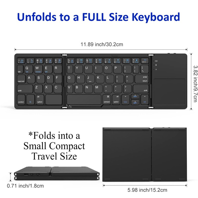 - ⌨【FOLDABLE TRI-FOLD DESIGN】 : Our FULL SIZE Travel Keyboard is Extremely thin and foldable keyboard can be a perfect gift for anyone who often travel or on a business trip. It allows you to operate your mobile devices on the go. Write fast, easy and error-free! It is also a good choice for editors
