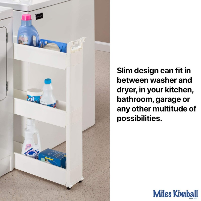 - Slim design can fit in between washer and dryer, in your kitchen, bathroom, garage or any other multitude of possibilities.