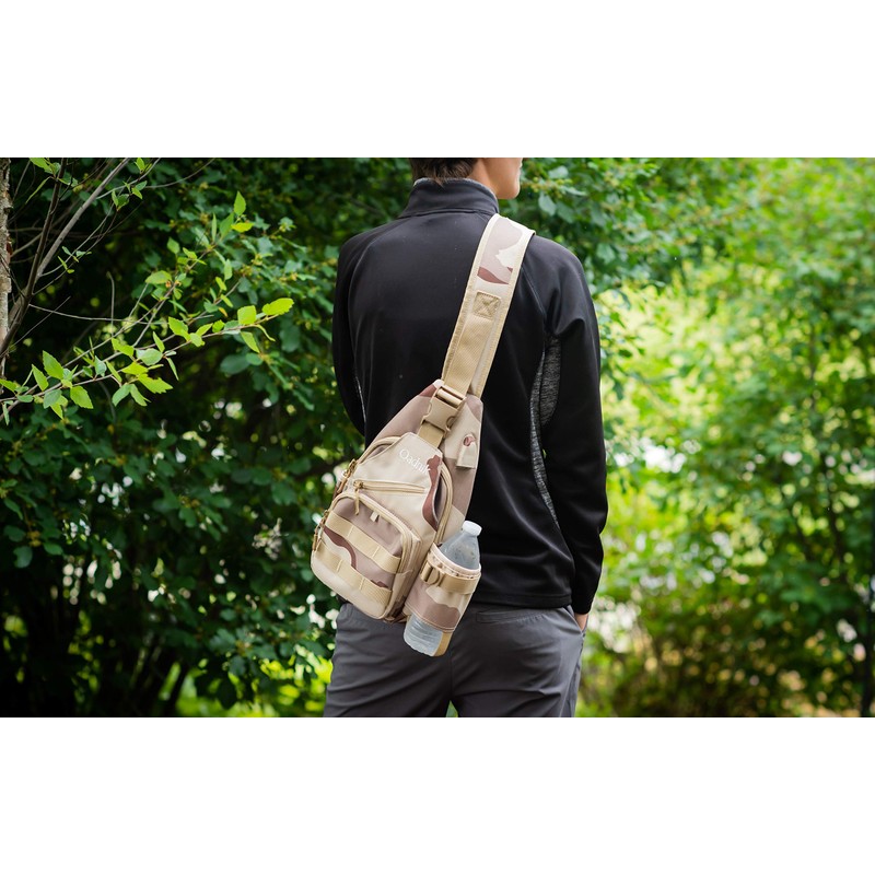 - HIGH QUALITY: Made of the best water proof Oxford 600D cloth, scratch-proof and wear resistant. Has built in external USB port with power bank, water bottle holder with restrainer strap, 3 main pockets, 1 open side pocket,1 concealed anti-theft pocket,and 2 tactical straps on the front. The adjustable padded strap can be attached to ether side for right or left shoulder.