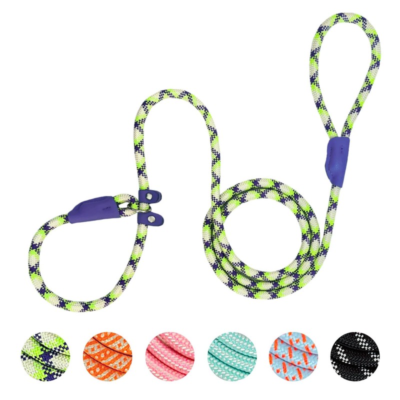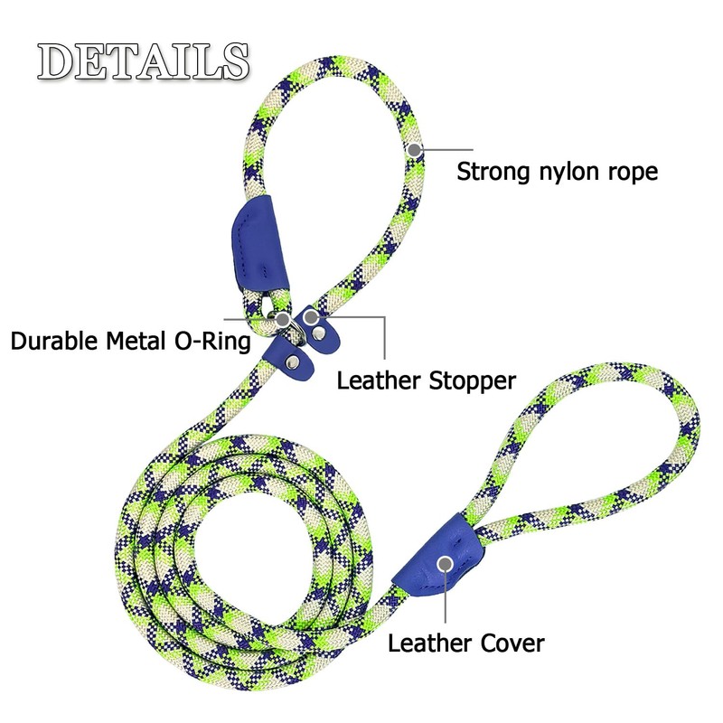 Strong Nylon 1/2" thick Rope, Leather stopper and knots cover, sturdy metal ring and the reflective straps provide maximum durability and security. Definitely, this is a great slip rope dog leash, make your walk easy every day.