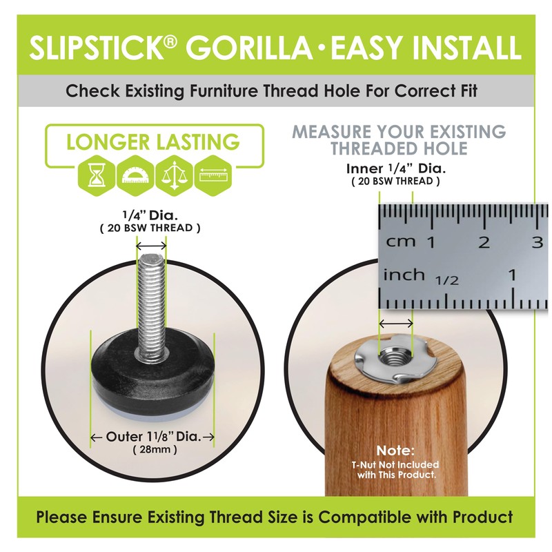 Slipstick Gorilla Outdoor Adjustable Furniture Levelers (8 Pack) Weatherproof Screw in Leg Glides for Chairs, Tables, and Outdoor Furniture Feet, 1-1/8 Inch Slider Glide, 1/4"-20 BSW Thread