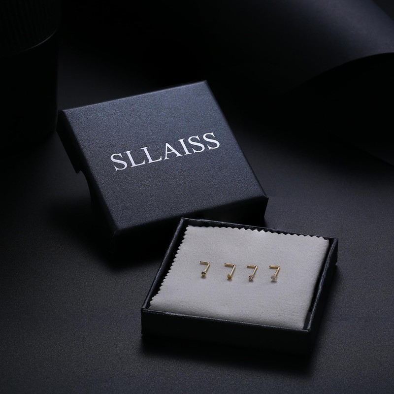 - L-shaped nose piercing jewellery set: each set of nose studs consists of four different types of nose stud: zircon/balls/discs. The set is available in gold and silver.