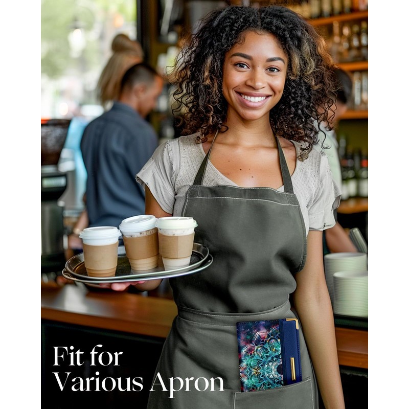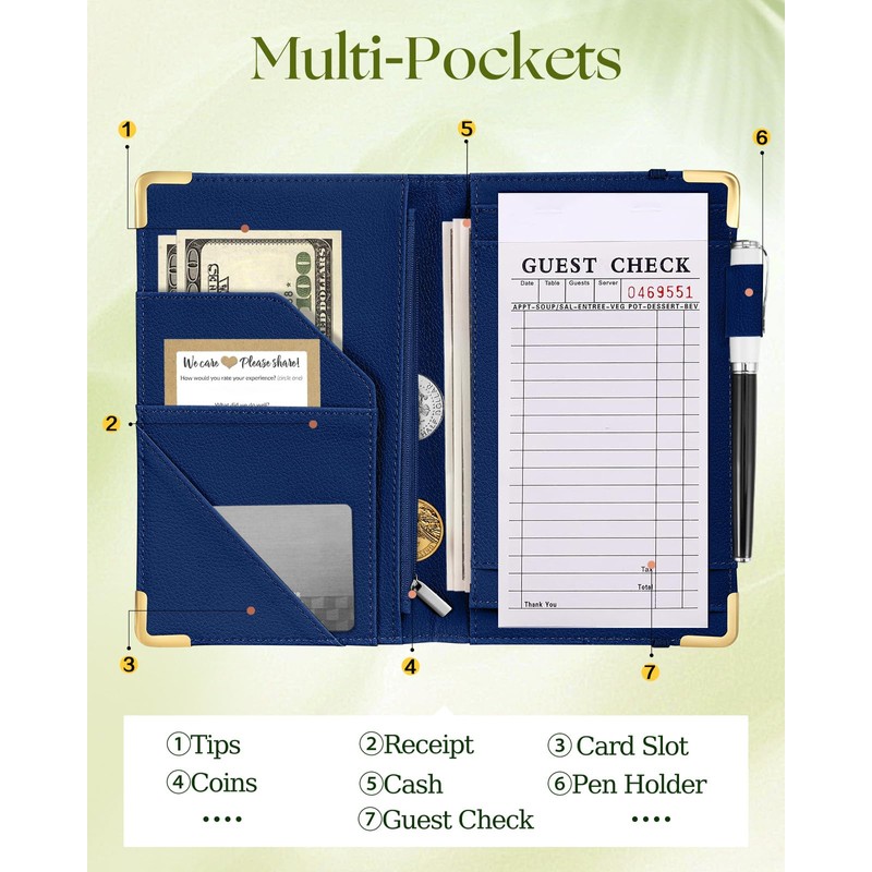 - 7 Storage SpacesThe Waitress notepad has 7 pockets: Credit card payment card slot,oupon menu pocket,bill pocket,coin zipper pocket,cash pocket,guest checkbook and pen holder.Tight zipper pockets allow you to store coins safely without worrying about them falling.Elastic suture pen hooks that can accommodate pens of any size.