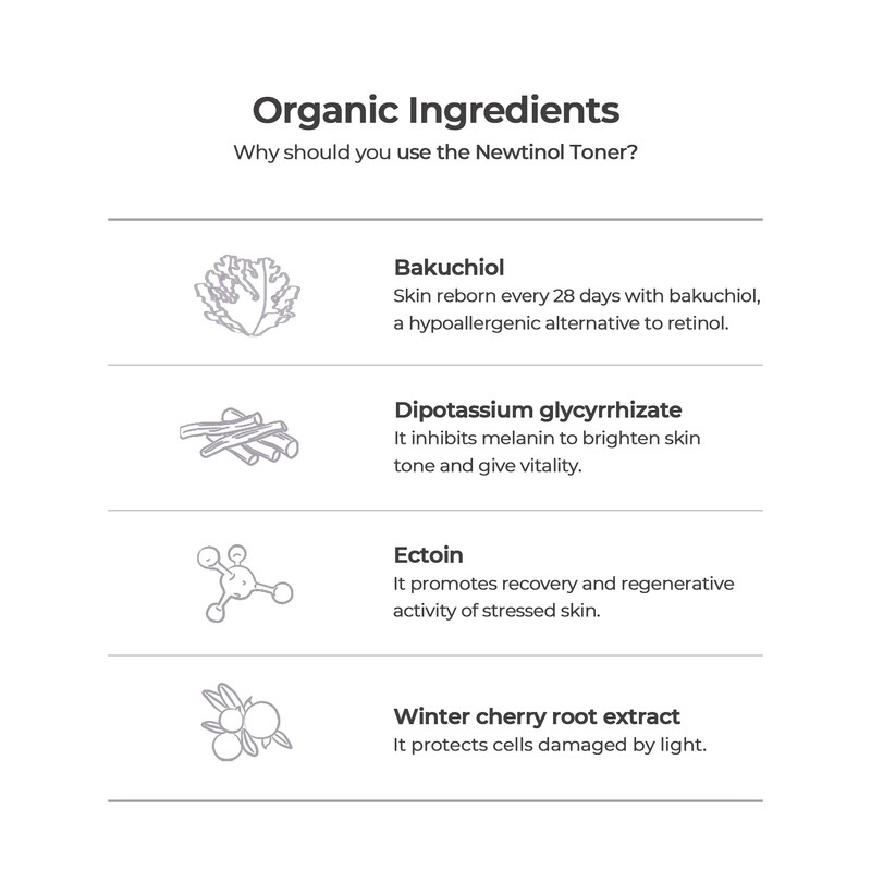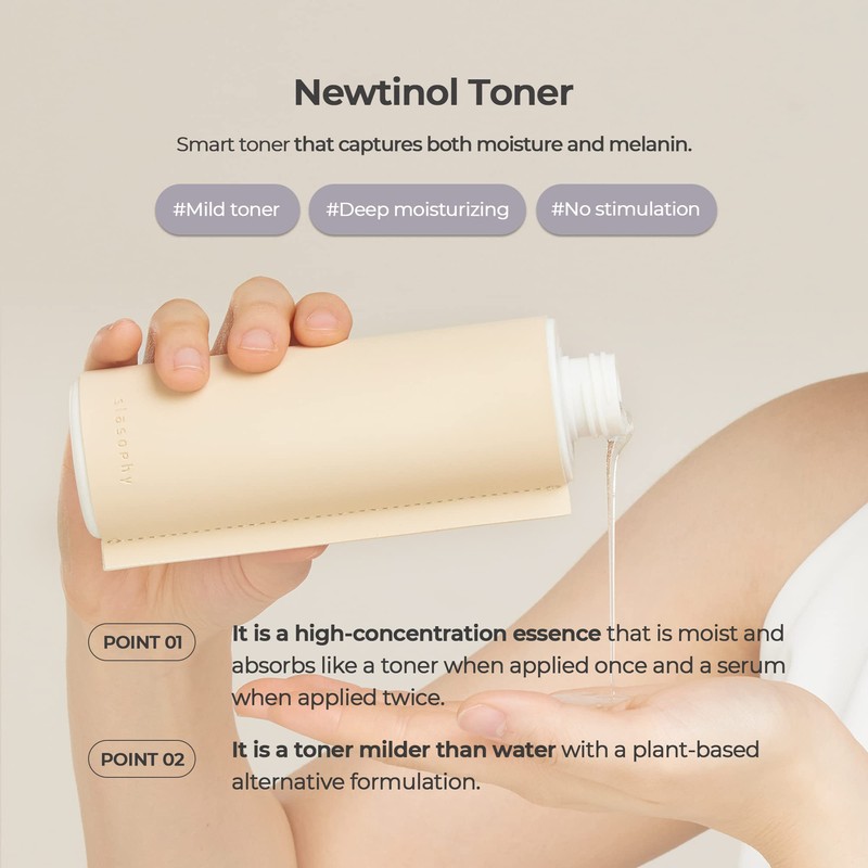 - NEWTINOL TONER: Smart toner that provides moisture and tackles hyperpigmentation. This is a non-stimulating product that is milder than water with a plant-based alternative formulation. Colorless toner with the texture and thickness of an essence. You will no longer need to use other ampoules, serums, or toners as this Newtinol Toner contains a high-concentration of essence that provides the same amount of moisture as serums or ampoules.
