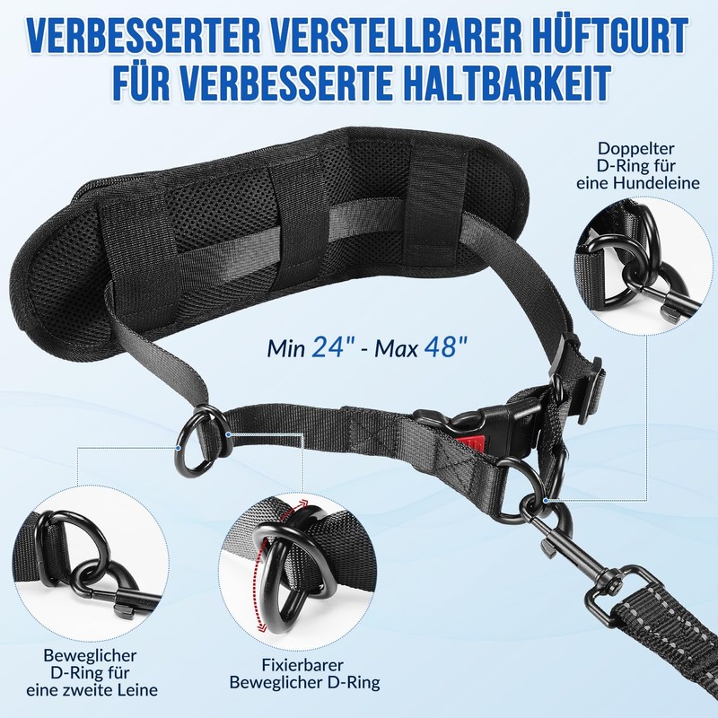 - Adjustable waist belt with D-ring: Our belts are equipped with a D-ring, simply remove the D-ring to give your dog more space on the run; attach the D-ring and insert the O-ring again so that it can hold another lead or become a waste bag hook.