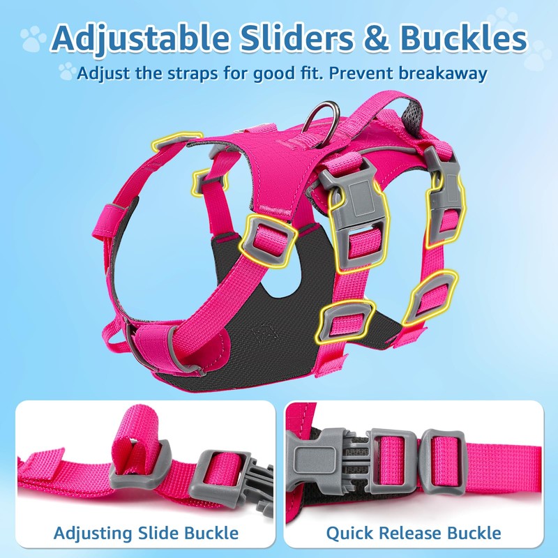 The escape-proof dog harness is designed with 6 adjustments, including 4 buckles, making the vest fit your dog's body and easy to slip on and off. In addition, the reflective webbing on the vest allows the dog to move safely at night