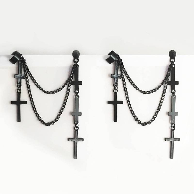 SLSF Unique Punk Multi Layered Long Stainless Steel Cross Chain Dangle Earring Hypoallergenic Threader Tassel Ear Cuff Black Drop Earring for Women Men Girls Statement Jewelry Gifts, Metal, n/p,