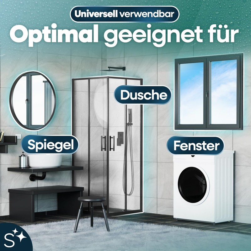 - Glass surfaces - The absorbent sparkling wipes dry cloth comes anywhere the shower squeegee does not reach - corners and edges become streak-free dry. This prevents moisture stains and mould formation