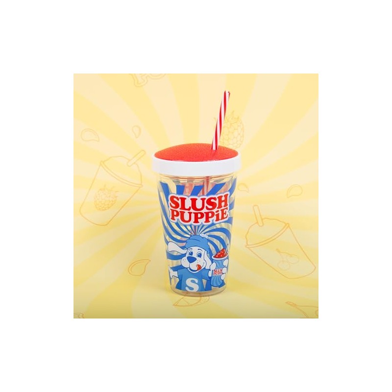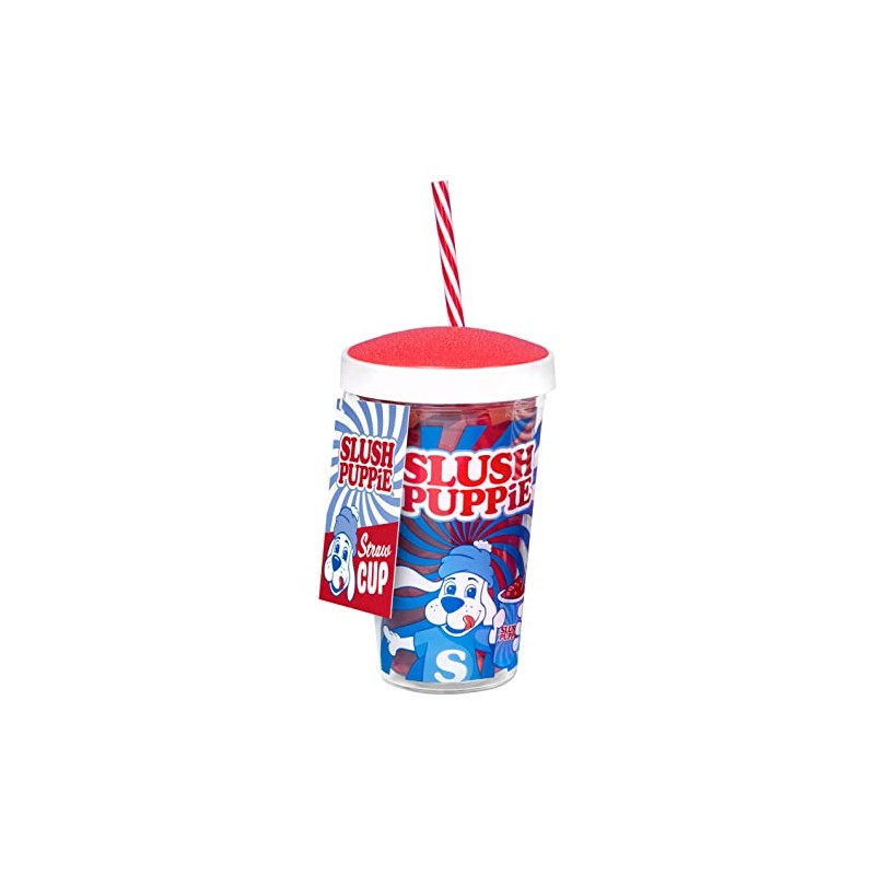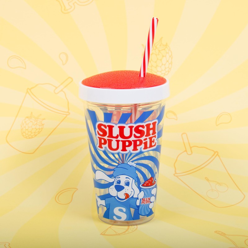 - The cool slushy cup made of transparent plastic comes in a funky red-blue design and features the iconic Slush Puppie logo. With a capacity of 450ml and a bendable straw through the lid, every sip will be a refreshing pleasure.