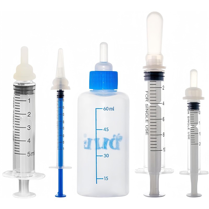 - Puppy Bottles for Nursing: 1ml for small nipples, 3ml, 5ml, 10ml for medium and large nipples, 60ml feeding bottles(Color random shipments of 60ml feeding bottle) can be freely combined with (small, medium, large) nipples. The feeding device is equipped with a special bottle brush for easy bottle cleaning.