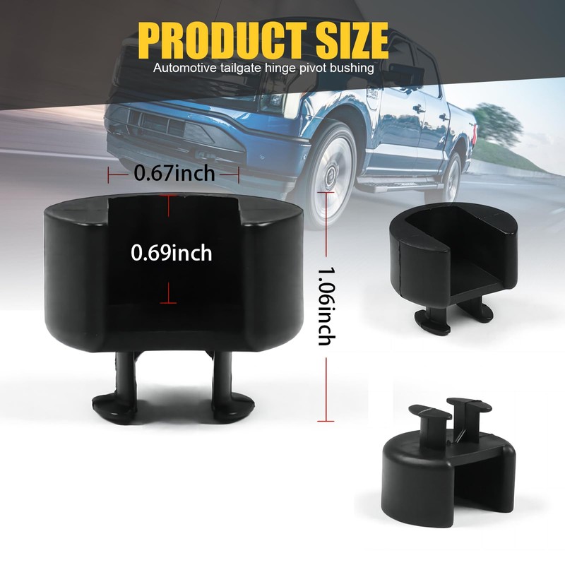 - Package Contents: You will receive a car tailgate hinge pivot bushing kit, which contains four bushings in three sizes 1.06" x 0.66", 1.33" x 0.74" x 0.59", and 1.69" x 0.78". You can buy with confidence. It is compatible with Dodge Ram Ford F-series. If you have any questions or concerns, please feel free to contact us and we will provide you with the best customer service.