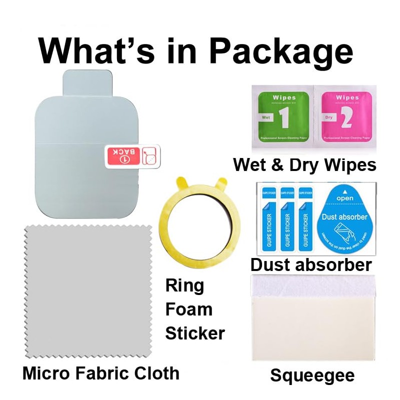 Package Included 6 x soft screen protectors; 6 x dry and wet wipes; 6 x dust removal stickers; 1 x micro fiber cloth, 1x Squeegee, 1 x Foam Ring Sticker