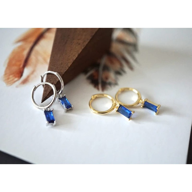 Small Baguette Dangle Hoop Earrings Drop Huggie Earring with Blue CZ Charm in 14k Gold Plated Sterling Silver for Women