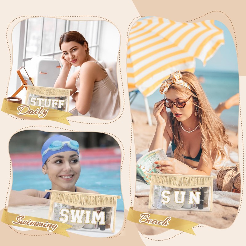Small Boho Straw Clear Sun Makeup Bags for Women&Girls, Zipper Cosmetic Bag Chenille Varsity Letter Patch Bag, Preppy Cute Toiletry Pouch, Trendy Organizer Storage Bag for Beach Travel Essentials
