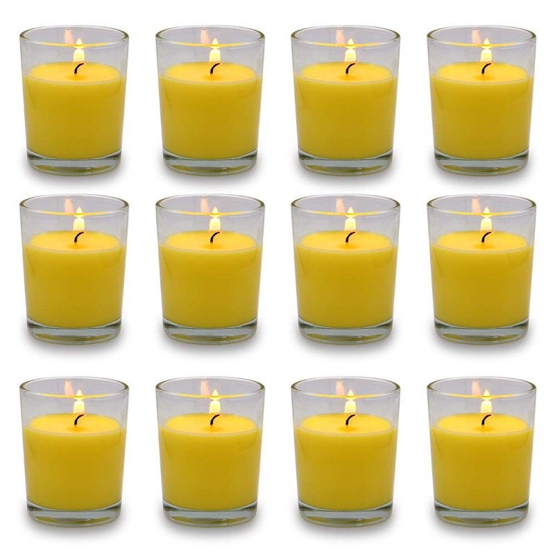 - MATERIAL: This citronella candles Infused with the oil of the citronella plant and natural soy wax, each votive candle has a burn time of 12 hours.