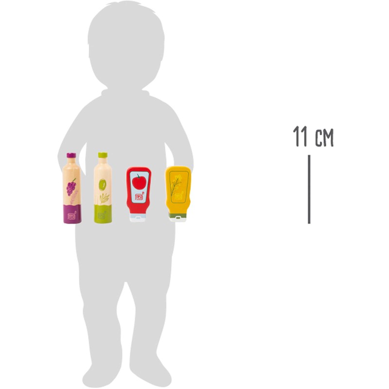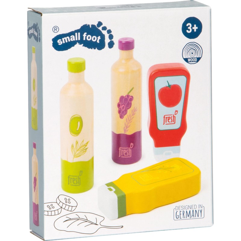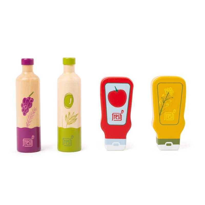 - A beautiful sauce set with 1 olive oil bottle, 1 vinegar bottle, 1 ketchup bottle, 1 mustard bottle as an addition to the children's kitchen or the grocery shop