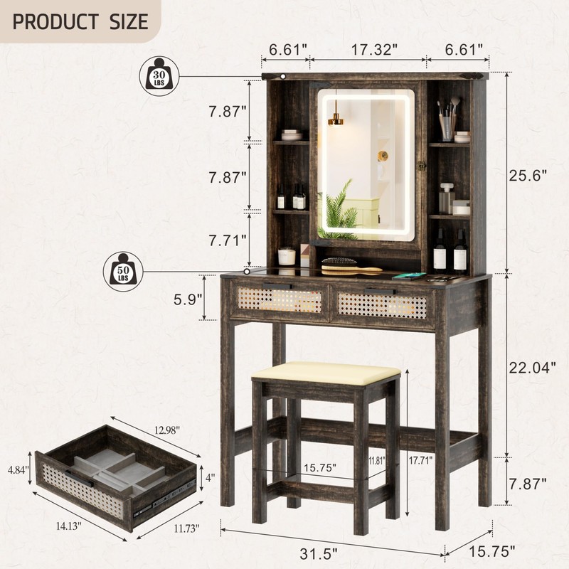- Perfectly Sized for Your Small Space: Measuring 31.5" W x 15.75" D x 55.51" H, our small vanity desk offers ample storage space with 6 open shelves and 2 rattan drawers. Perfect for organizing and displaying your cherished cosmetics and beauty essentials