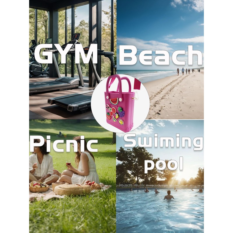 - Compact Design: This small rubber beach bag features a simple, modern aesthetic with a fuchsia pink color and perforated holes for drainage.