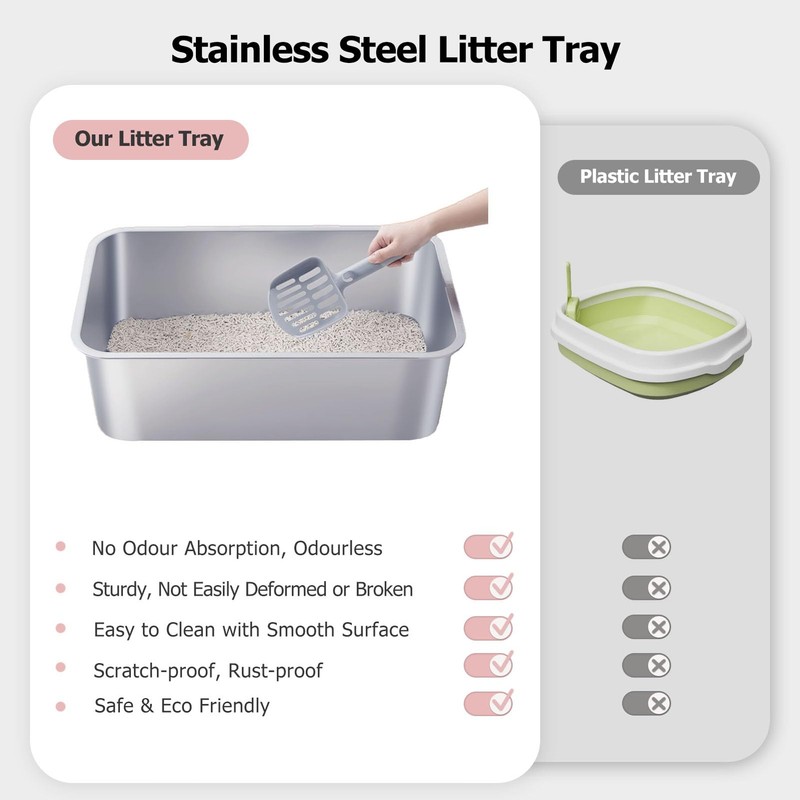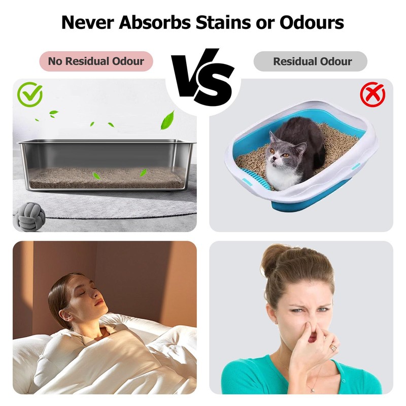 - 【ODOURLESS】Stainless steel litter trays do not absorb stains and odours like plastic litter trays do, there's no residual odour that can't be cleaned away in the long term