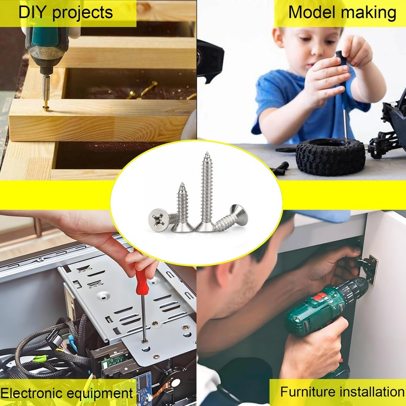 - WIDE APPLICATION: Wood screws can be used for office and electronic equipment, modeling, workplace fasteners, boat assembly, furniture repair, DIY and other projects. (Not suitable for hard materials such as hard metals and walls, pre-drilling a pilot hole is recommended)