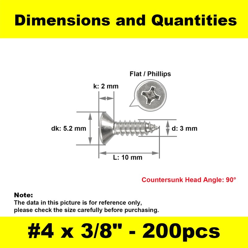 - STANDARD SIZES: There are 200 self-tapping flat head wood screws in metric sizes of M3 x 10mm and imperial sizes of #4 x 3/8 inch.