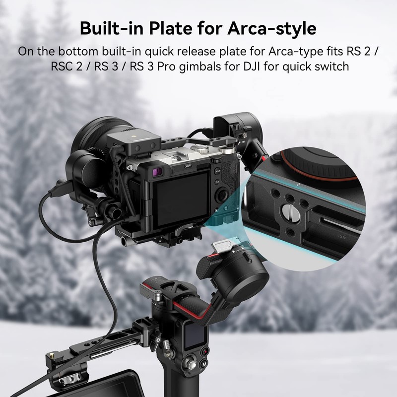 - Arca-Swiss: With a built-in Arca Swiss quick release system, the cage allows the quick change between tripod, hand and gimbal shots