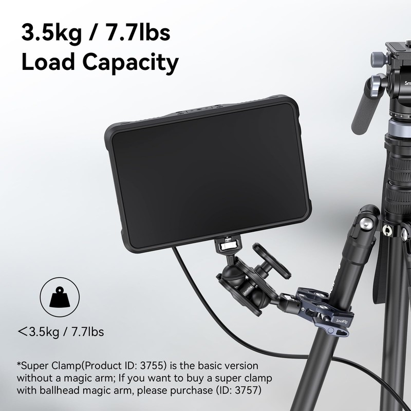 SmallRig Crab-Shaped Clamp 3755B is made of aircraft-grade aluminum alloy and stainless steel, CNC machined, and carved to increase sturdiness and durability. It features a skeletal design and shark clamp with stronger clamping force as well as widely compatible 1/4""-20 threaded holes, 3/8""-16 threaded holes. The clamp, which supports rod of a minimum diameter of 14mm and a surface with a maximum thickness of 65mm, can quickly attach cameras, monitors, LED lights, etc. to round pipes, tables, handlebars, tripods, and stabilizer handheld rings. In addition, built-in cushions provide protection and clamping stability.