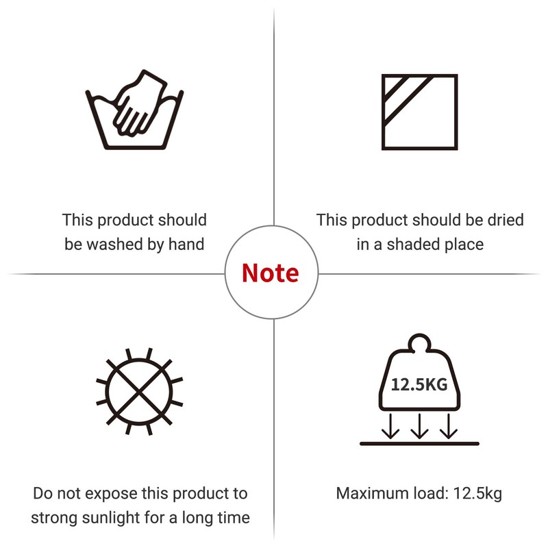 - Nota: 1. Carga de seguridad: 12,5 kg. 2. No exponer al sol. 3. Lavar a mano y secar en un lugar fresco y ventilado.