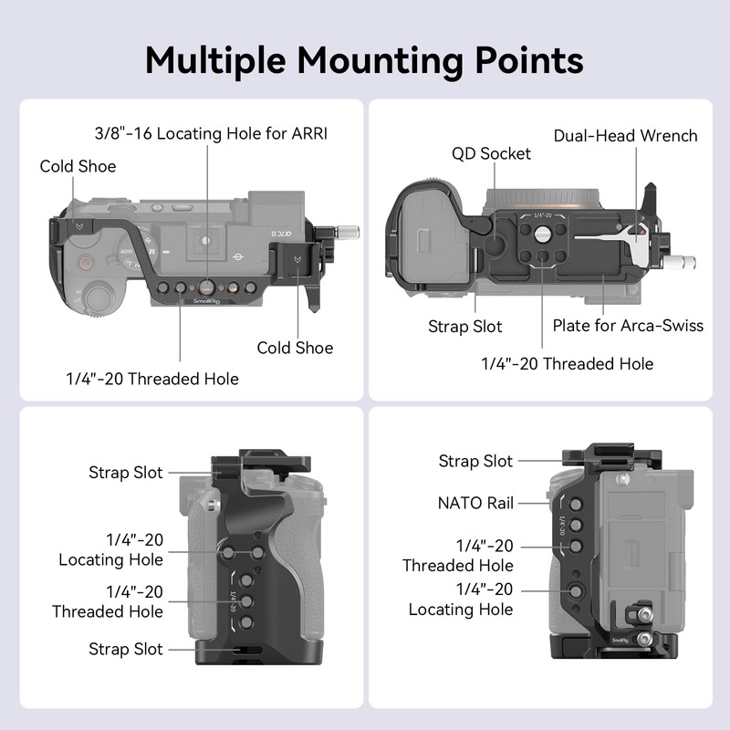 The SmallRig Cage Kit for Sony Alpha 7C II / Alpha 7CR 4422 is used to attach accessories and protect the camera and HDMI port. Comes with a cage and cable clamp for HDMI. The cage secures the camera with a 1/4"-20 screw on the bottom and an M2.5 screw on the right side, with built-in pads preventing scratches. Its hinge arm on the battery compartment adapts better to the camera curve and leaves room for the little finger for more comfort. The cable clamp for HDMI quickly attaches to the left side of the cage with a thumb screw, protecting the HDMI port to ensure stable transmission. Comes with multiple attachment points for attaching accessories, including 1/4"-20 threaded holes and 3/8"-16 positioning holes for ARRI for top handle 3765, side handle 2913; a top 3/8"-16 positioning hole for ARRI for monitor mount 2903B; cold shoes for microphone, LED video light; NATO rail one NATO rail for the rotating NATO handle (left side) 3260; built-in M4 threaded holes on the bottom front, compatible with the horizontal to vertical mounting plate 4424, allow for quick change between vertical and horizontal recording; and a lower QD socket for mounting shoulder straps. The quick release plate for Arca Swiss on the bottom supports DJI RS 2 / RSC 2 / RS 3 / RS 3 Pro gimbals as well as the quick release plate for DJI RS 2 / RSC 2 gimbals and the quick release plate for Arca-Type 3154. The cage also has holes on both sides and bottom for attaching accessories such as hand strap 3848, shoulder strap PSC2428 etc. In addition, a magnetic Allen key is included for easy disassembly and assembly.