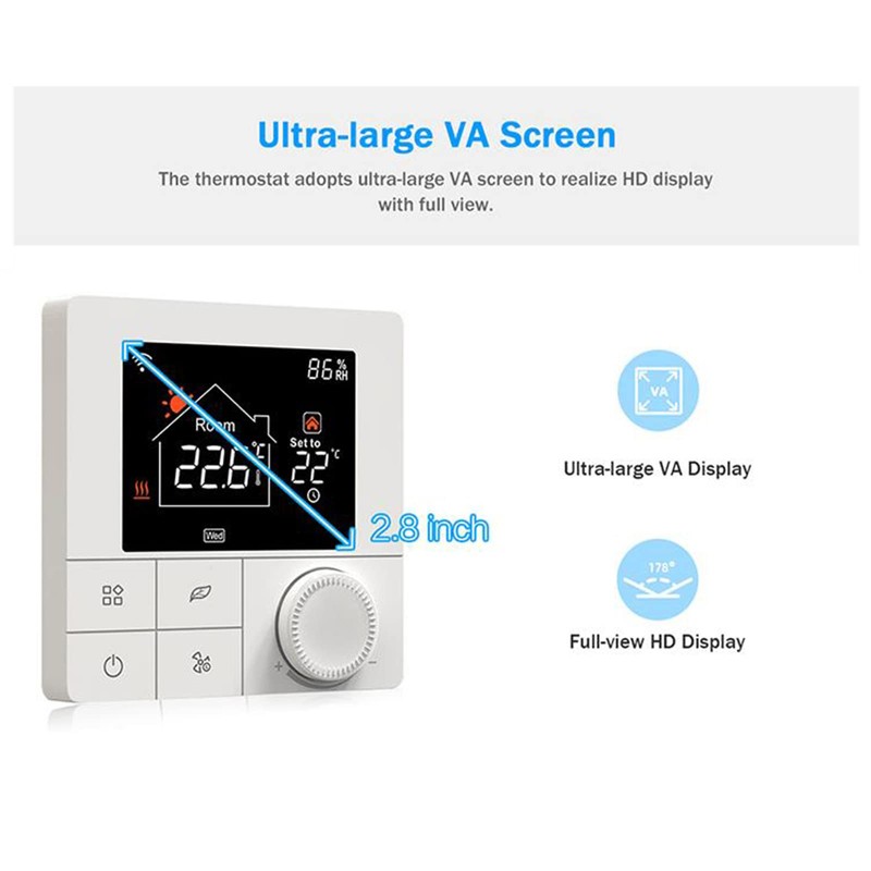 With smart energy-saving solutions, our Smart Thermostat offers you absolute convenience and efficient functionality. The unique combination of button and handwheel operations brings flexibility and an enriched experience. You can even set the thermostat remotely via an app on your phone. The inclusion of voice control through Home and makes using this Smart Thermostat even more seamless. Its handwheel design ensures that you can set temperatures precisely, with an incremental scope of 0.5°C. With a large 2.8-inch LCD screen, it includes features like weather forecast, frost protection, and child lock function for a complete control experience in one device.