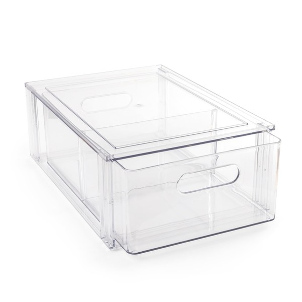 Smart Design Pull-Out Stackable Storage Bin with Removable Dividers - Large - 13.75" D x 9.85" W x 5.30" H- Clear