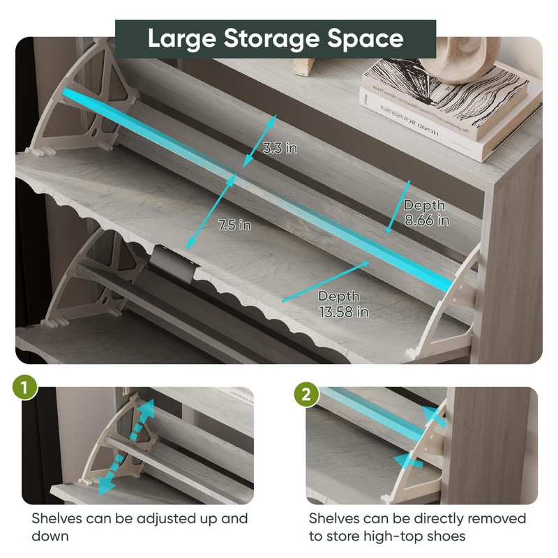 - LARGE STORAGE SPACE: In addition to the spacious desktop, the shoe cabinet's two bottom drawers, each with two levels of storage, can easily accommodate a wide range of sizes and types of shoes, from flats to mid-calf boots and high heels; each drawer has adjustable or removable panels, which can be easily customised to accommodate shoes of different heights; the bottom space is ideal for slippers or quick access to shoes