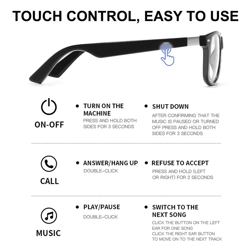 - Free your hands: Once you connect the glasses to your phone via Bluetooth, a simple touch is all it takes to answer calls or play music. Perfect for when you're driving, cycling, or engaged in outdoor activities where your hands are tied up.