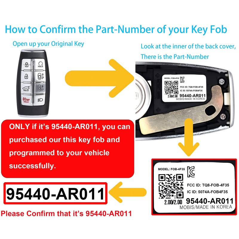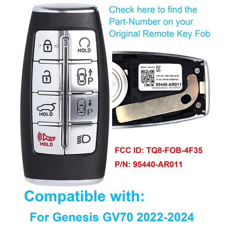 - 【Note】Pls check the compatibility, verify the Part Number:95440-AR011, FCC ID: TQ8-FOB-4F35 are the same as your original key before you order it. Make sure it has the same shape with your Hyundai Genesis GV70 original key. This is a non-OEM product, aftermarket accessory only! Package Included: 1 x Car Keyless Entry Remote (Battery included). Full satisfaction risk free purchase within 90 days. If the remote does not work out for any reason, simply contact us for a refund or replacement