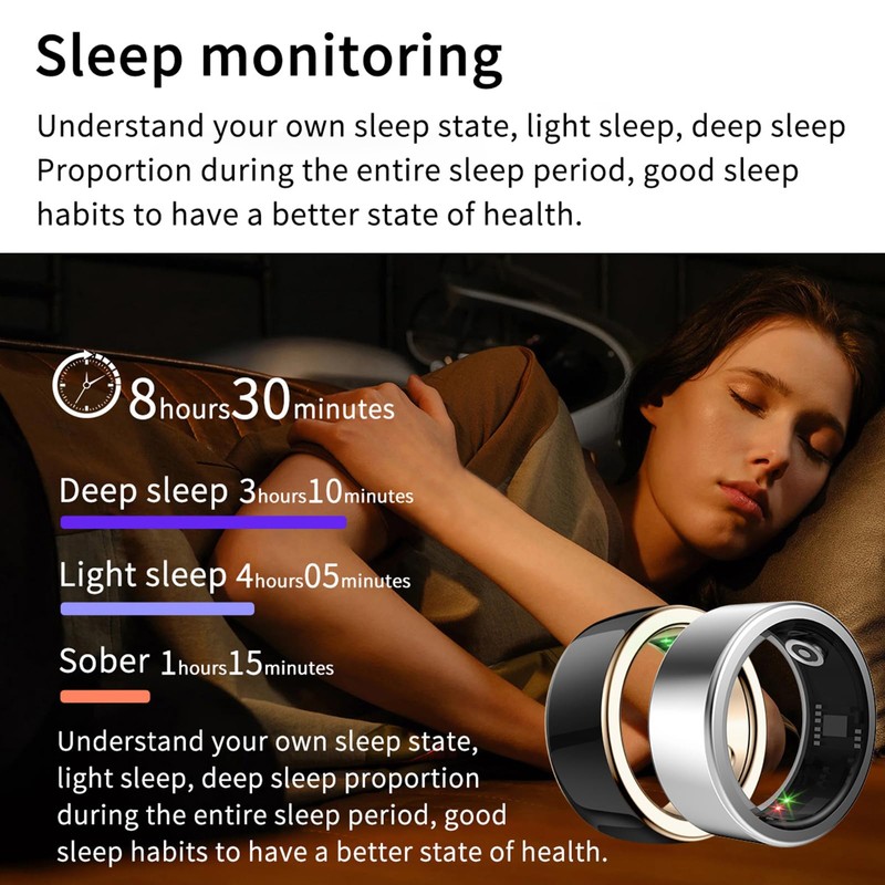 - Health Tracker Ring ★ The fitness ring is always on your physical and mental health. The health ring can monitor the heart rate in real time. Real-time heart rate monitoring allows you to better understand your heart rate trends and heart rate changes. The sleep monitoring function identifies sleep time, including wake time, deep sleep and light sleep. Help maintain a good sleeping habit.