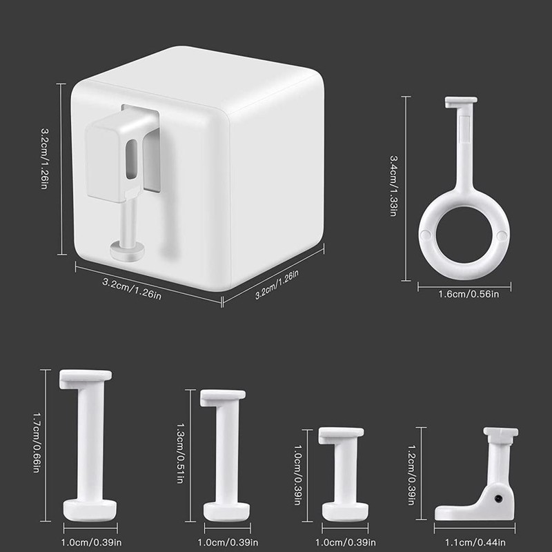 1、1. Smart APP/timing control: Smart Life/Tuya can directly control switch via Bluetooth. You can also configure the smart switch to turn all functions on and off according to your own schedule. For example, turn on the coffee machine before getting up. 2、2. Use the gateway to be smarter: Using the wireless gateway (only 2.4GHz WiFi is supported), you can remotely control the smart buttons anytime and anywhere, and enable voice control. Use with compatible for Google Assistant and Siri. This is a perfect home assistant. (The gateway needs to be purchased separately,The gateway needs to support the Bluetooth protocol) 3、3. Easy to install: The smart switch button can be used with almost any rocker switch and button on any device. Place it directly next to the rocker switch or button with sticker. No tools, simple operation. 4、4. Built-in replaceable battery: Built-in 3V CR123A battery, one can be used for half a year, long-term battery life, when the battery is dead, it can be easily replaced by opening the back cover. 5、5. Toolkit: The toolkit is equipped with mechanical arms of various lengths and shapes. This switch can change his finger type. Can adapt to more scenarios (need to be purchased separately)