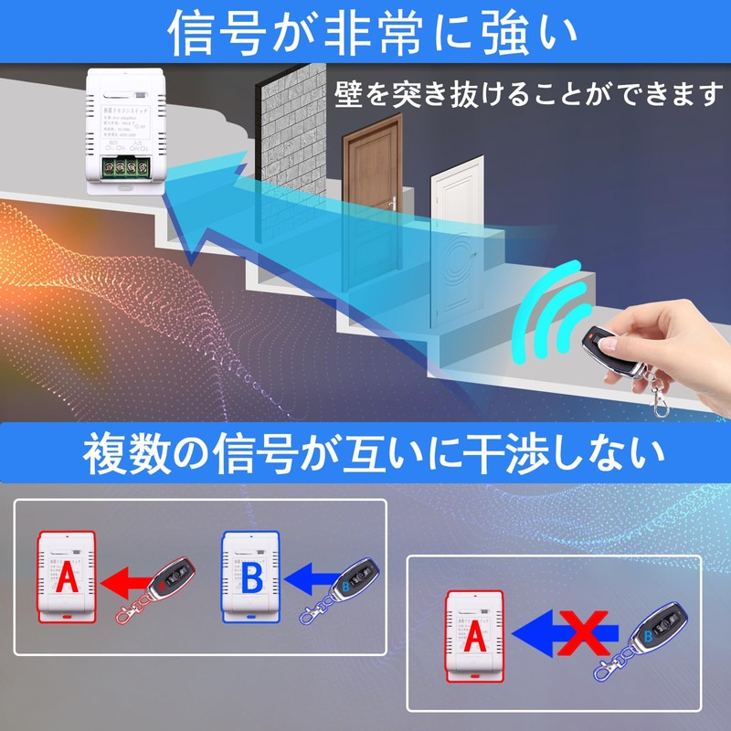 - **RF Smart Remote Control** The remote control system of this remote control switch is an RF remote control to stabilize the signal. The wireless RF switch signal passes through walls, floors, and doors, allowing you to control the receiver from anywhere within a reliable distance. The receiver can be installed in a hidden place, no need to align the controller with the remote control when using, the maximum range is 50-200 meters (different remote distance depending on the location)