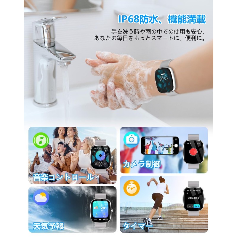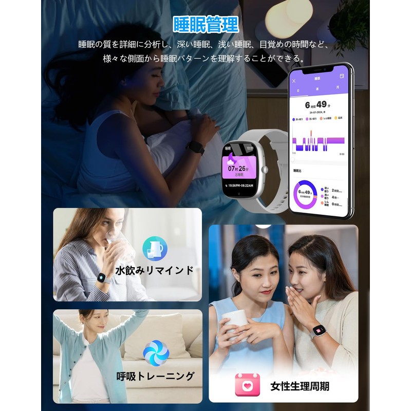- (Health Management & Full of Practical Functions) Not only does it record your daily steps, distance and calories in your daily life, but it also has functions such as sitting alert, relaxing, heart rate, and sleep management. For the health of a woman, it also includes a menstrual cycle recording and notification. The stylish design is suitable for both women and men in work and life. It is packed with convenient features such as finding your smartphone, remote shooting, alarm, timer, stopwatch, arm lift, screen brightness adjustment, sleep mode, weather forecast, flashlight, music control, and multi-language support