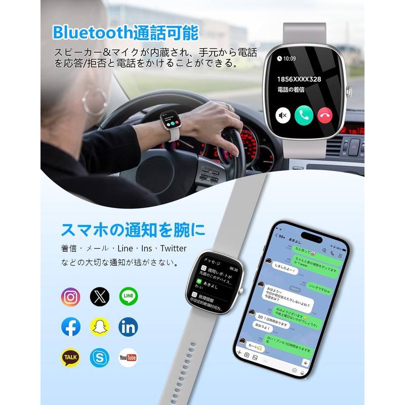 - Bluetooth Call Function & Incoming Call Notification: This smart watch allows you to take calls without taking out your smartphone, providing you with great convenience for daily work, life, and driving. Connected with the dedicated app, you can make and answer calls directly from the smart watch, turn on the speaker function, check your call history and save your call history. The caller's name and phone number will be displayed on the watch. The smart watch also has voice assistant function. In addition, notifications such as LINE, Facebook, Twitter, and so on, you won't miss any important messages. The intensity of the notification vibration can be set on the clockside