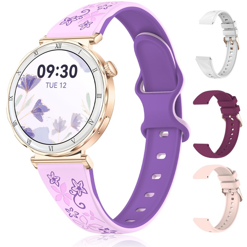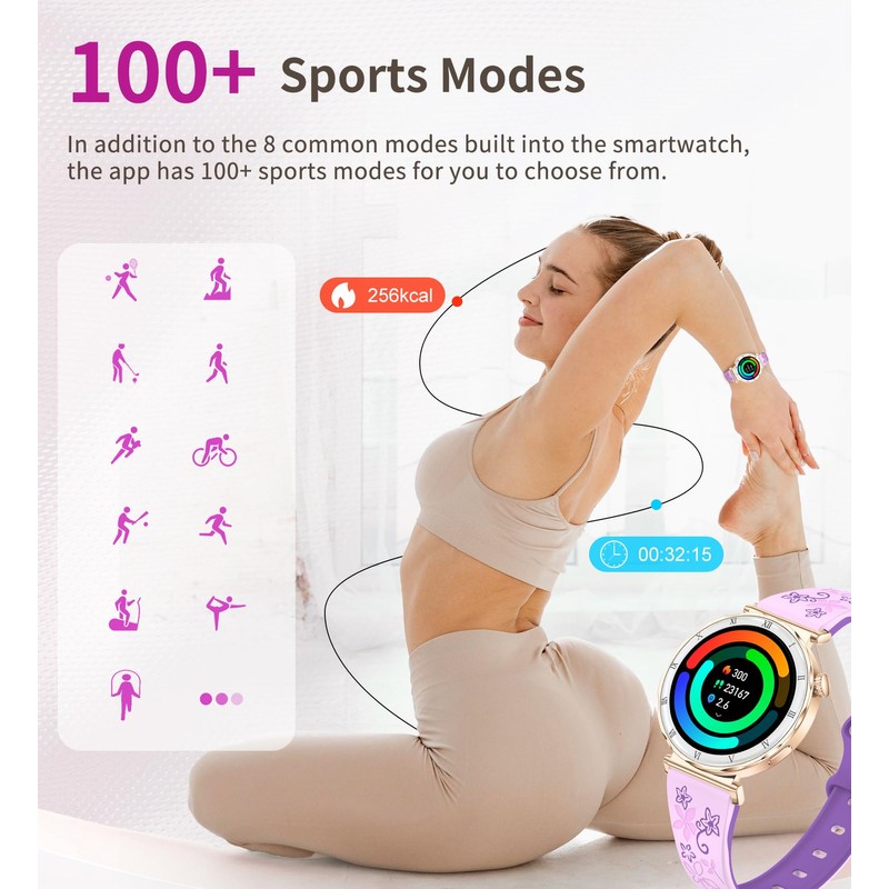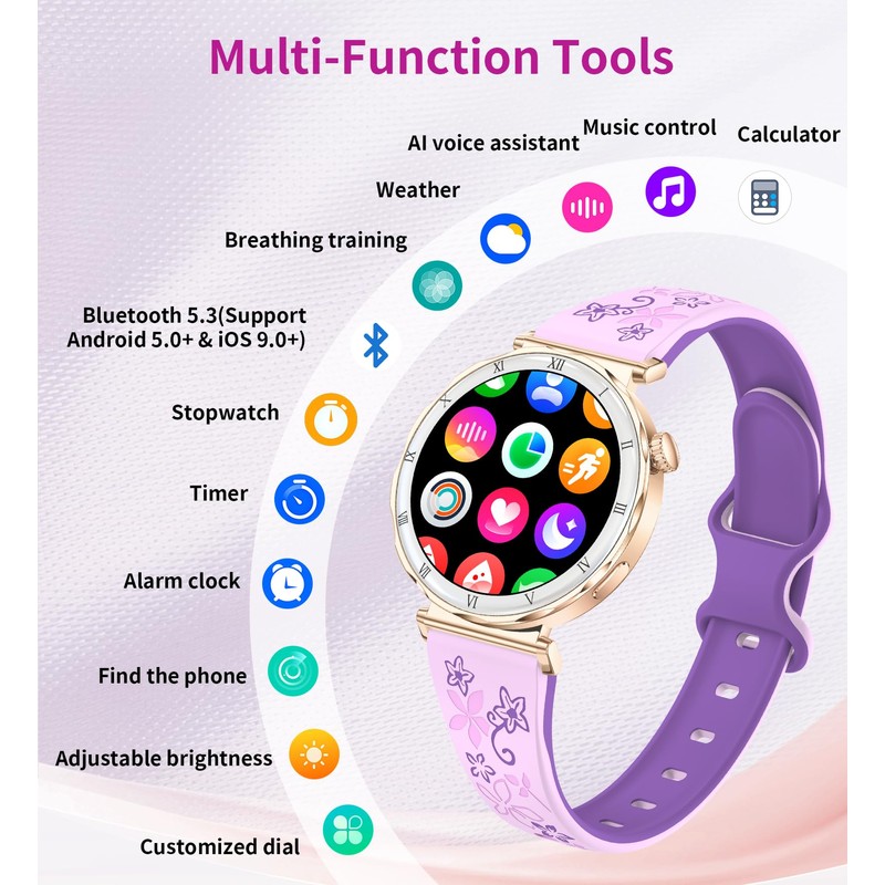 - 【4 Straps, 4 Styles】1.19-inch AMOLED HD screen with a rose gold frame and elegant white Roman numeral bezel, featuring a compact and elegant design; the women smartwatch comes with 4 straps:1× Floral-engraved two-tone strap for visual appeal; 1* white ice-crystal silicone strap - smooth and textured; 1* pink silicone; 1* burgundy silicone.