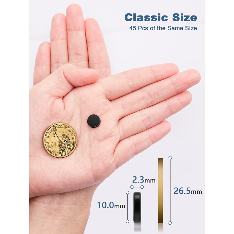 - Useful Design - Despite of its small size (Diameter: 10 mm, thickness: 2.3 mm), each magnet is able to hold at least 15pcs sticky notes. You don't have to worry it's not able to fixate the paper.