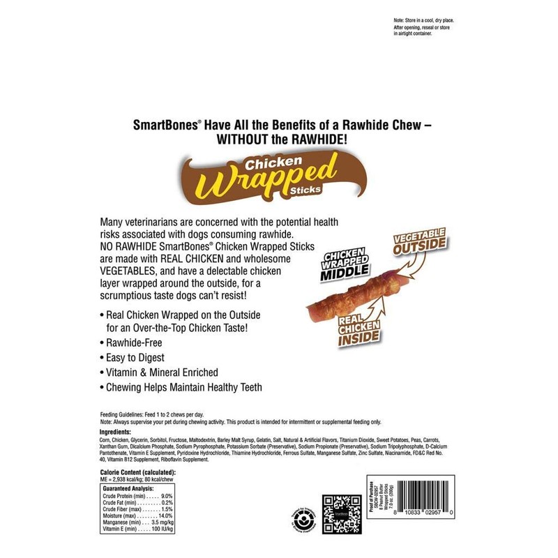 "SmartBones chews have all the benefits of a rawhide chew…without the rawhide! No-rawhide SmartBones chews are made with real chicken, beef, bacon and cheese or sweet potato and wholesome vegetables for a scrumptious taste dogs can’t resist! Many veterinarians are concerned with the potential health risks associated with dogs consuming rawhide. No-rawhide SmartBones Chicken-Wrapped Sticks with Peanut Butter for dogs are made with real chicken, wholesome vegetables and real peanut butter. They have a delectable chicken layer wrapped around the outside for a scrumptious taste dogs can’t resist. These chews are enriched with vitamins and minerals and are perfectly sized for your dog. They’ll love the vegetable outside and delicious chicken inside and outside. These fun-shaped treats are easy to digest, making them chews both you and your dog can love! Each individual pack contains 8 chicken- wrapped sticks. SmartBones chews will never compromise on quality. Our quality control team monitors everything, everywhere — ingredients, manufacturing processes, factory equipment, storage and much more — to make sure that our chews are made, stored and shipped according to U.S. Food and Drug Administration (FDA) standards in facilities that are among the most modern in the world. SmartBones brand is revolutionizing pet chews – and this is just the beginning!"